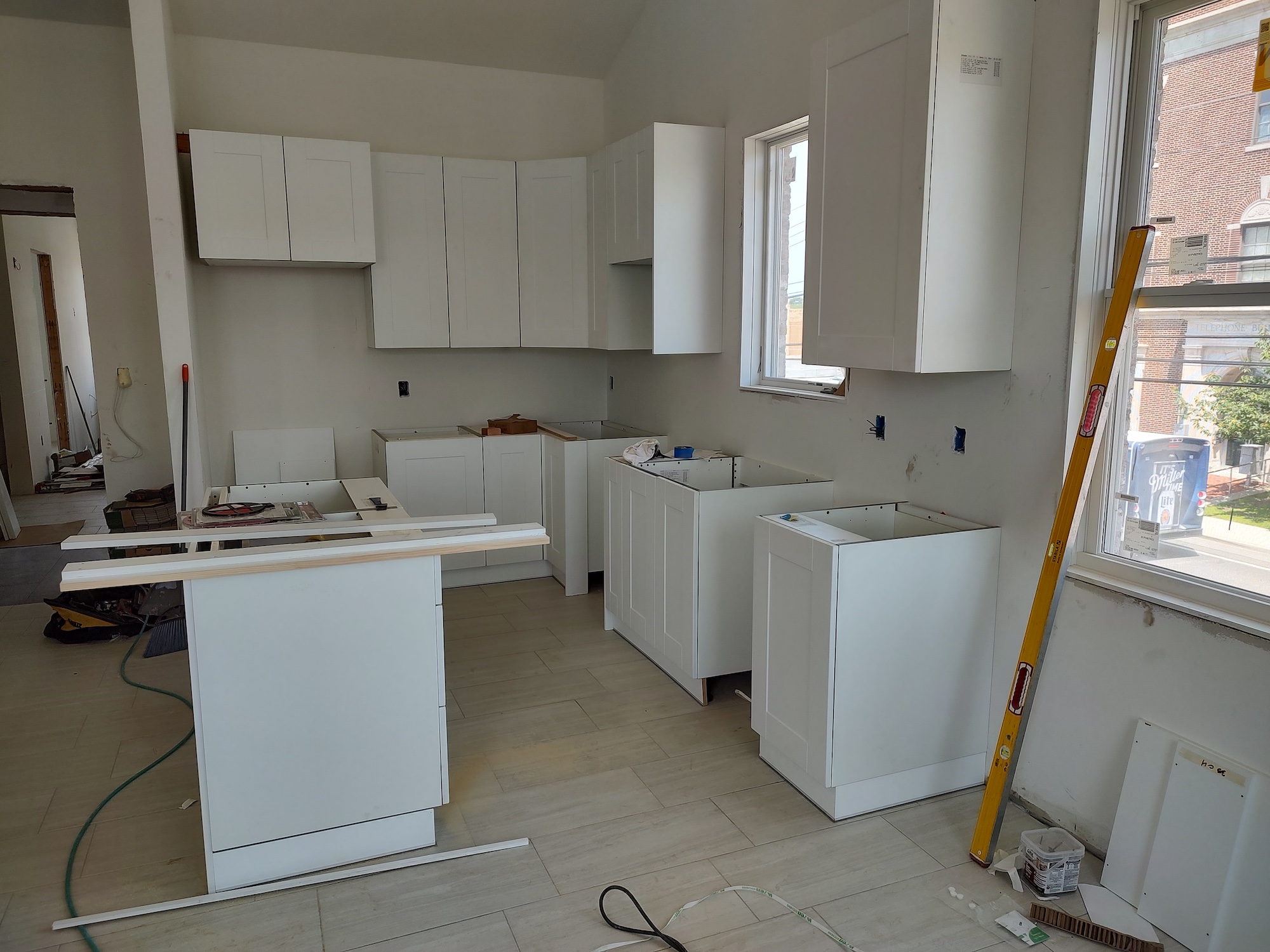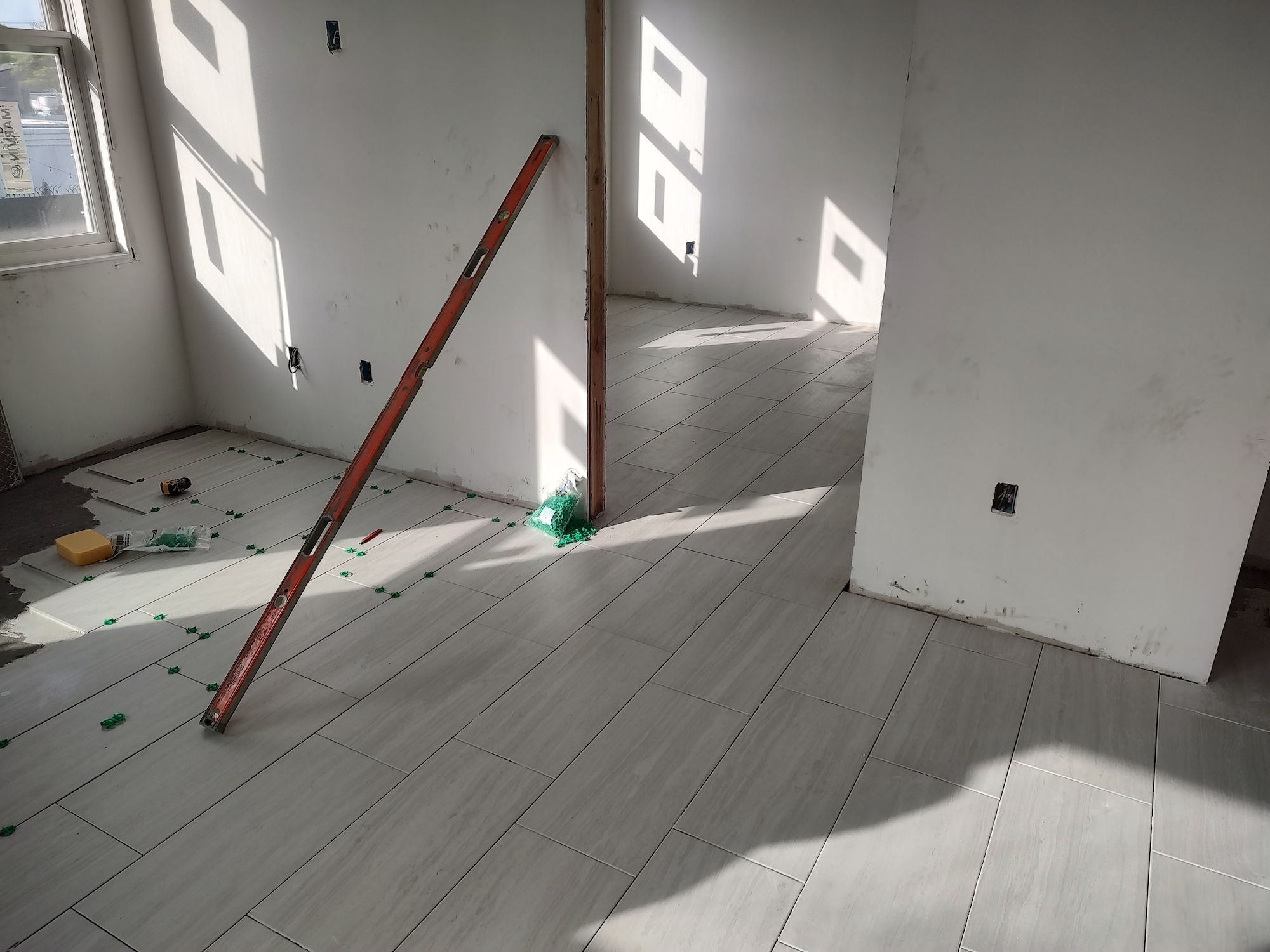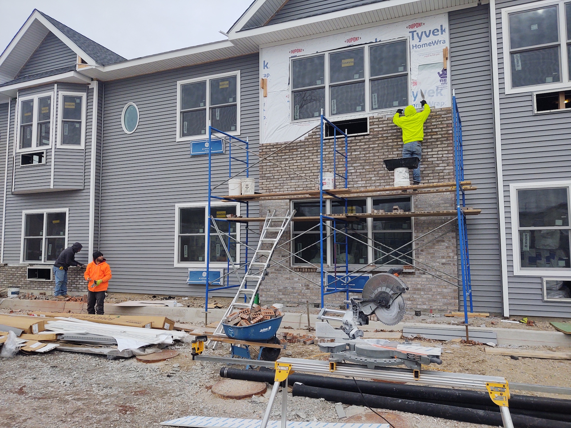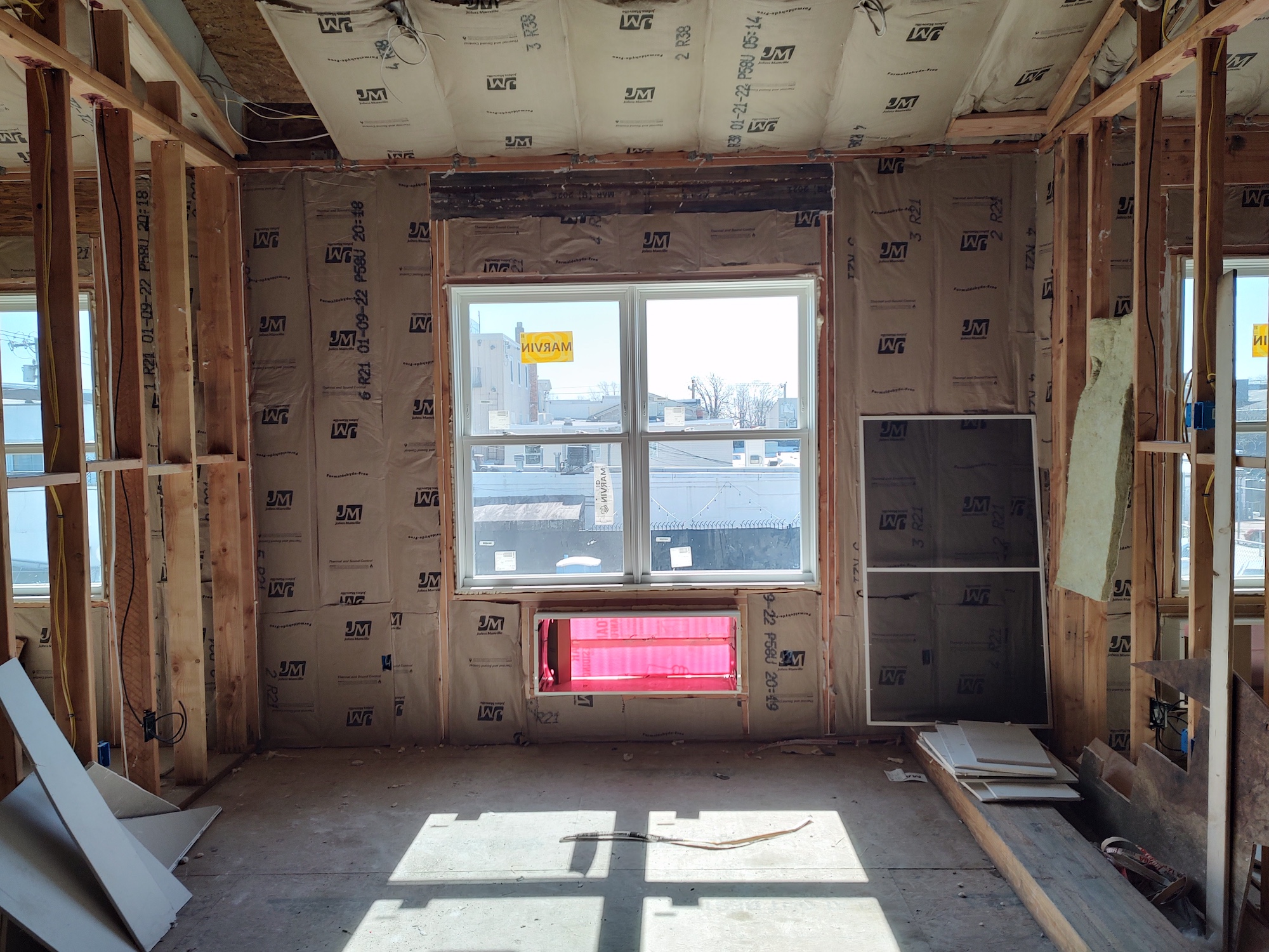 - Interiors: Insulation, drywall, large-format tile, and kitchen casework installation.
